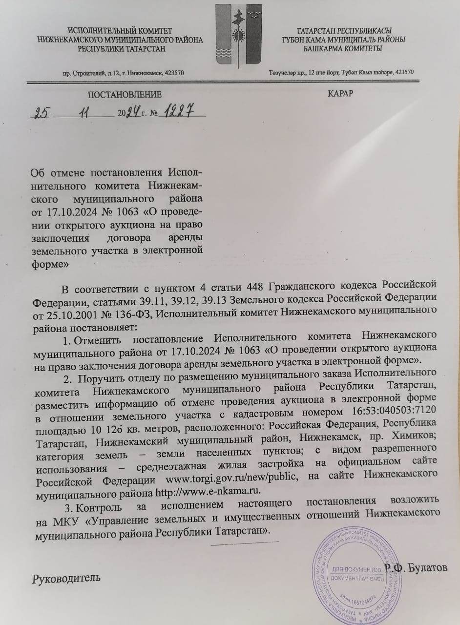 Постановление Исполнительного комитета Нижнекамского муниципального района от 25 ноября 2024 года № 1227 «Об отмене постановления Исполнительного комитета Нижнекамского муниципального района от 17.10.2024 № 1063 «О проведении открытого аукциона на право заключения договора аренды земельного участка в электронной форме»». []
