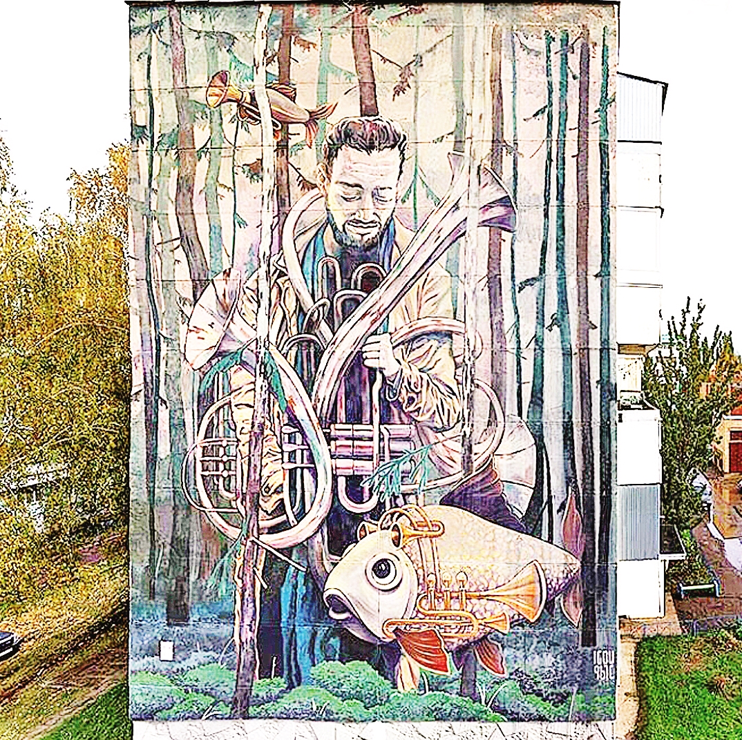 В прошлом году новый парк Камских Полян украсила сюрреалистическая картина под открытым небом - на торце пятиэтажки граффитисты изобразили музыканта в сокровенный момент вдохновения от красоты окружающей природы. Тема многозначная, и зрителю здесь действительно есть чем вдохновиться. А если на картину долго смотреть, можно даже услышать музыку, и у каждого она будет своя. И цветовая гамма приятная - светлая и лёгкая. Но интрига начинается, когда взгляд опускается в нижний угол панно, к подписям - IGOU и QBic. Помните граффити из водокачки?