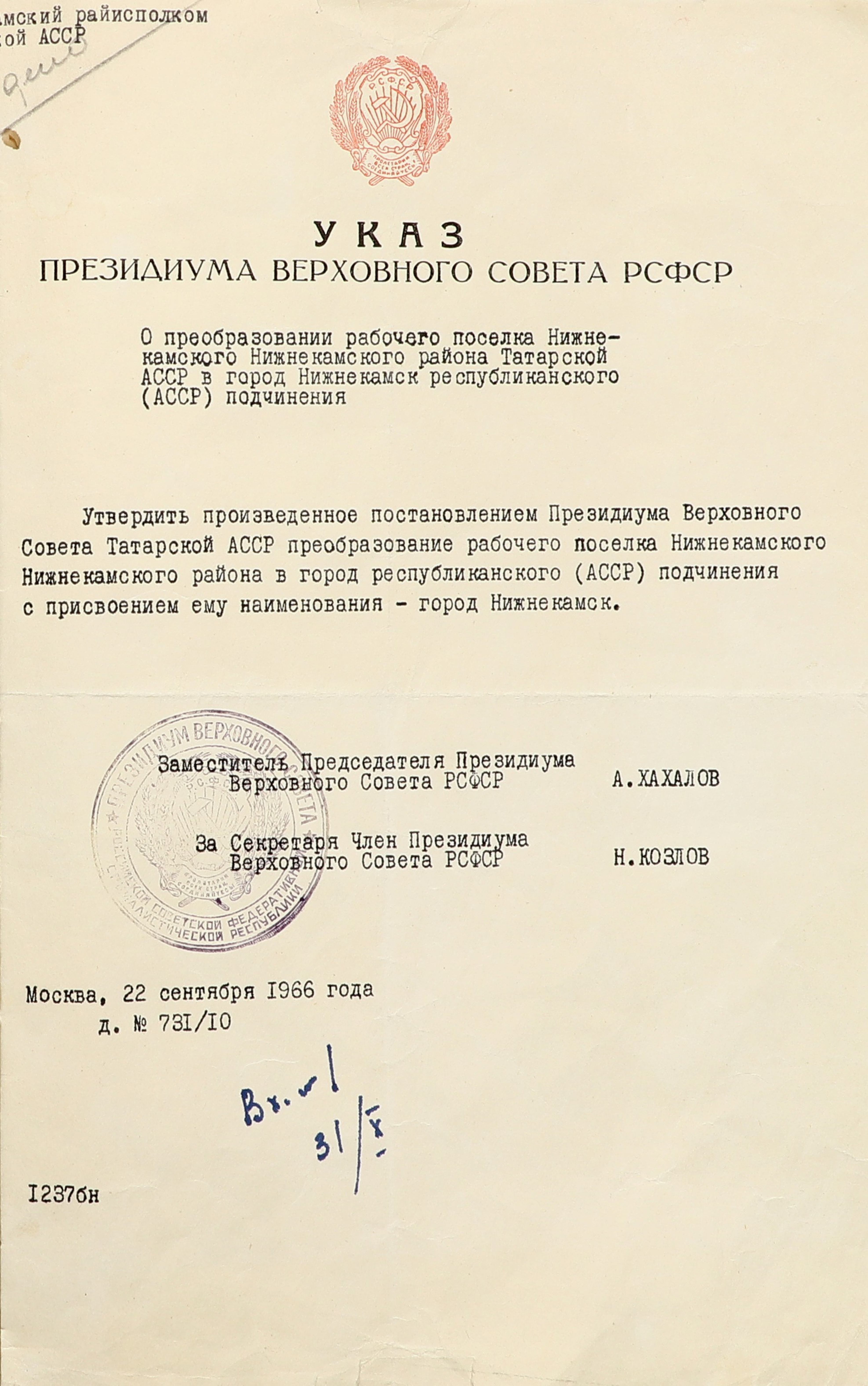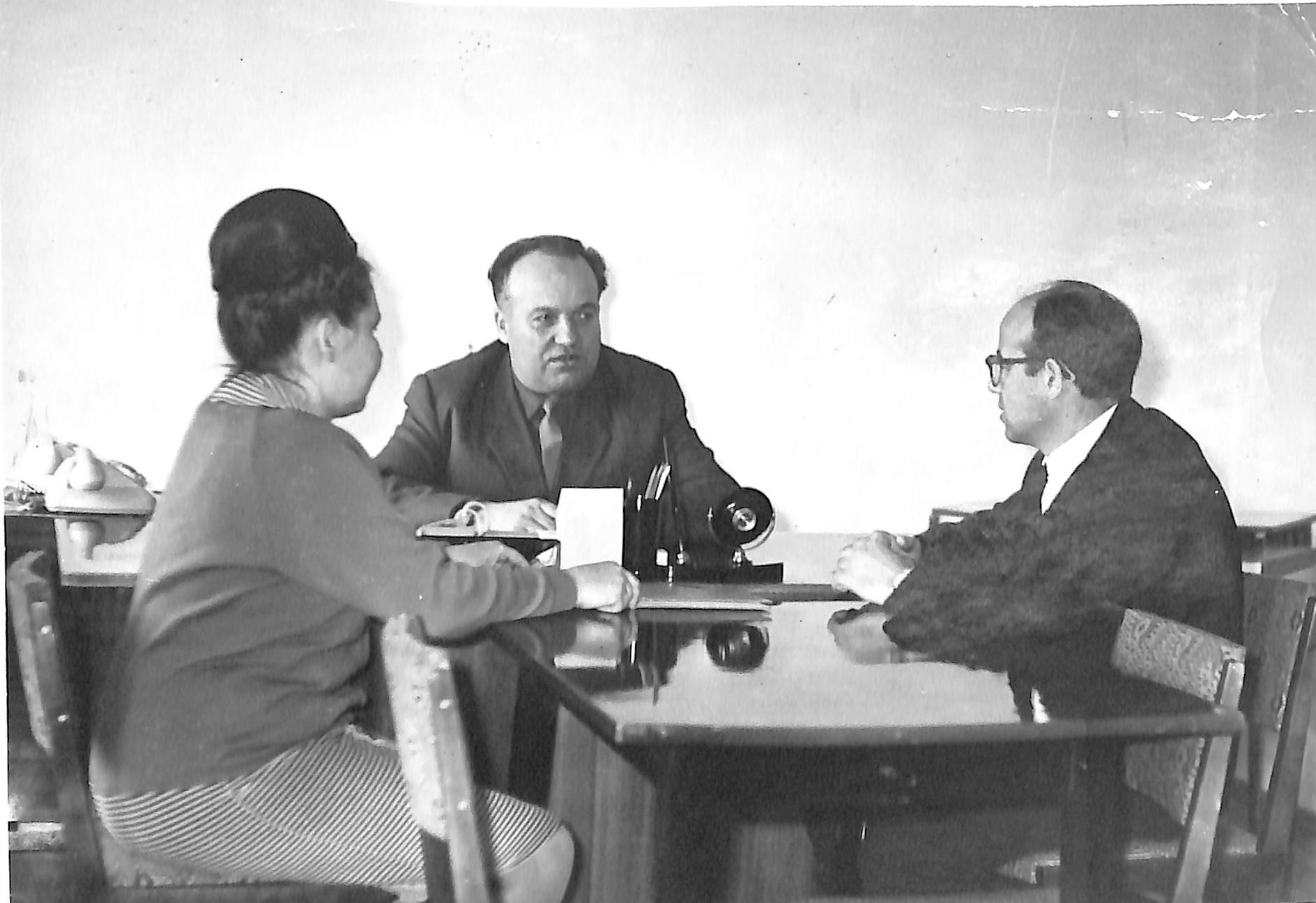 Первая заведующая Нижнекамским городским архивом - Л. Ф. Тукташева на приеме у председателя исполкома Нижнекамского горсовета (1966-1970 г.г) Пименова Ивана Алексеевича с секретарем исполкома горсовета Фатхрахмановым Рафкатом Фатхрахмановичем.