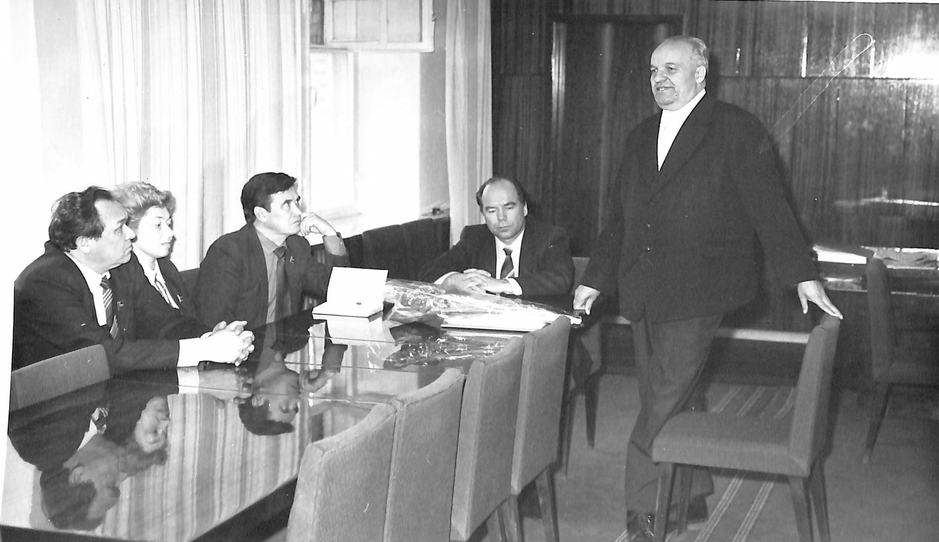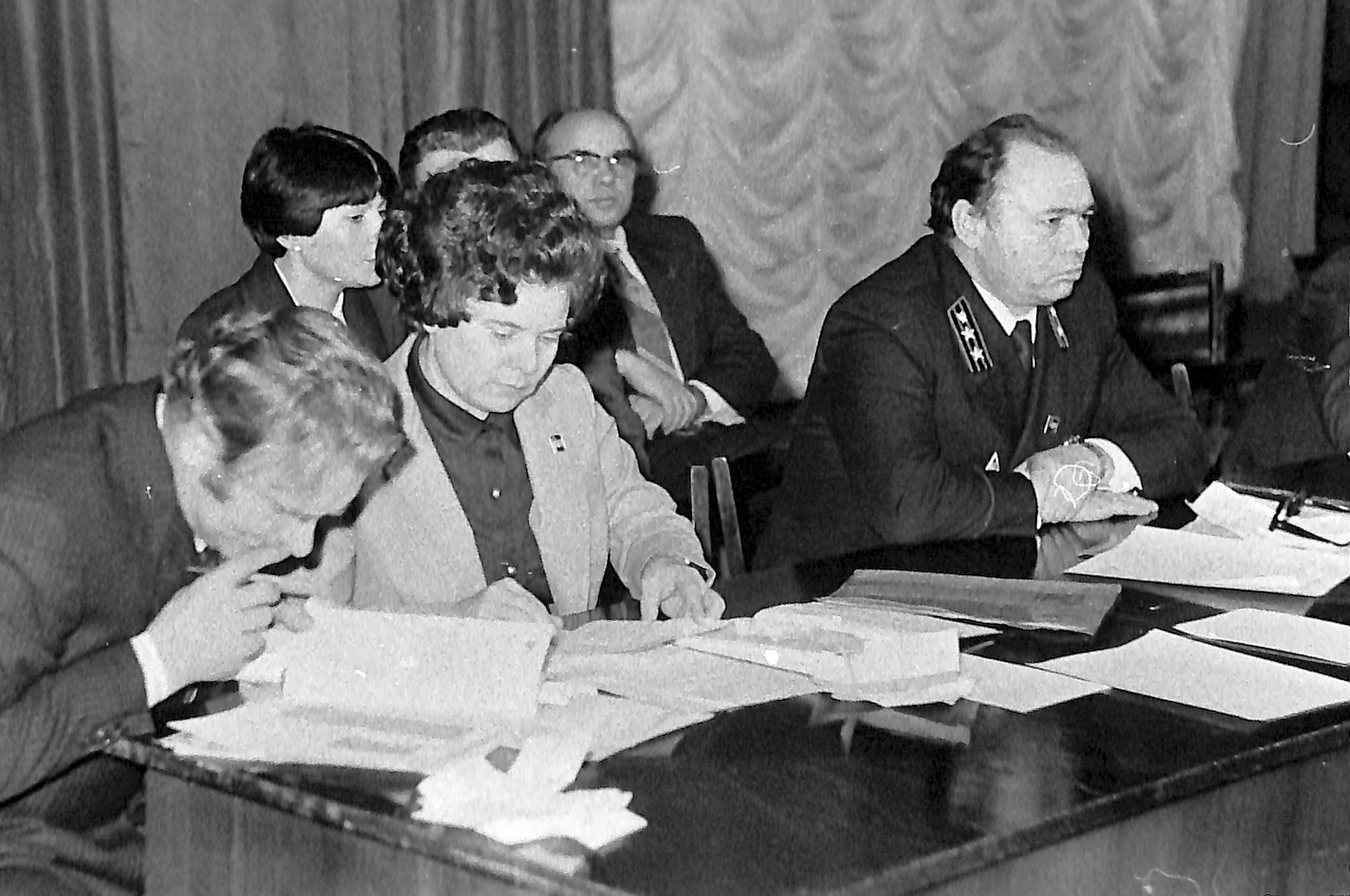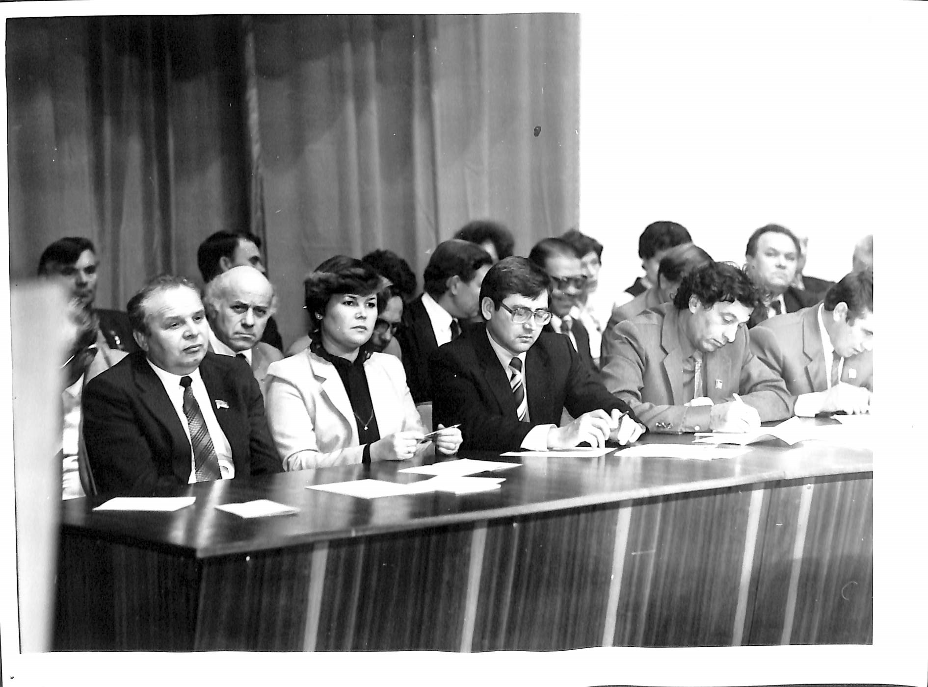 VI сессия горсовета. Слева направо: начальник института проектирования городов «Гипрогор» Шмах Лев Романович; секретарь ГК КПСС по идеологии Зиятдинова Флера Газизовна; руководитель ГК КПСС (1982-1989 г.г) Шамгунов Роберт Шакирович, заместитель директора Нижнекамского химкомбината Глянц Рафаил Григорьевич.