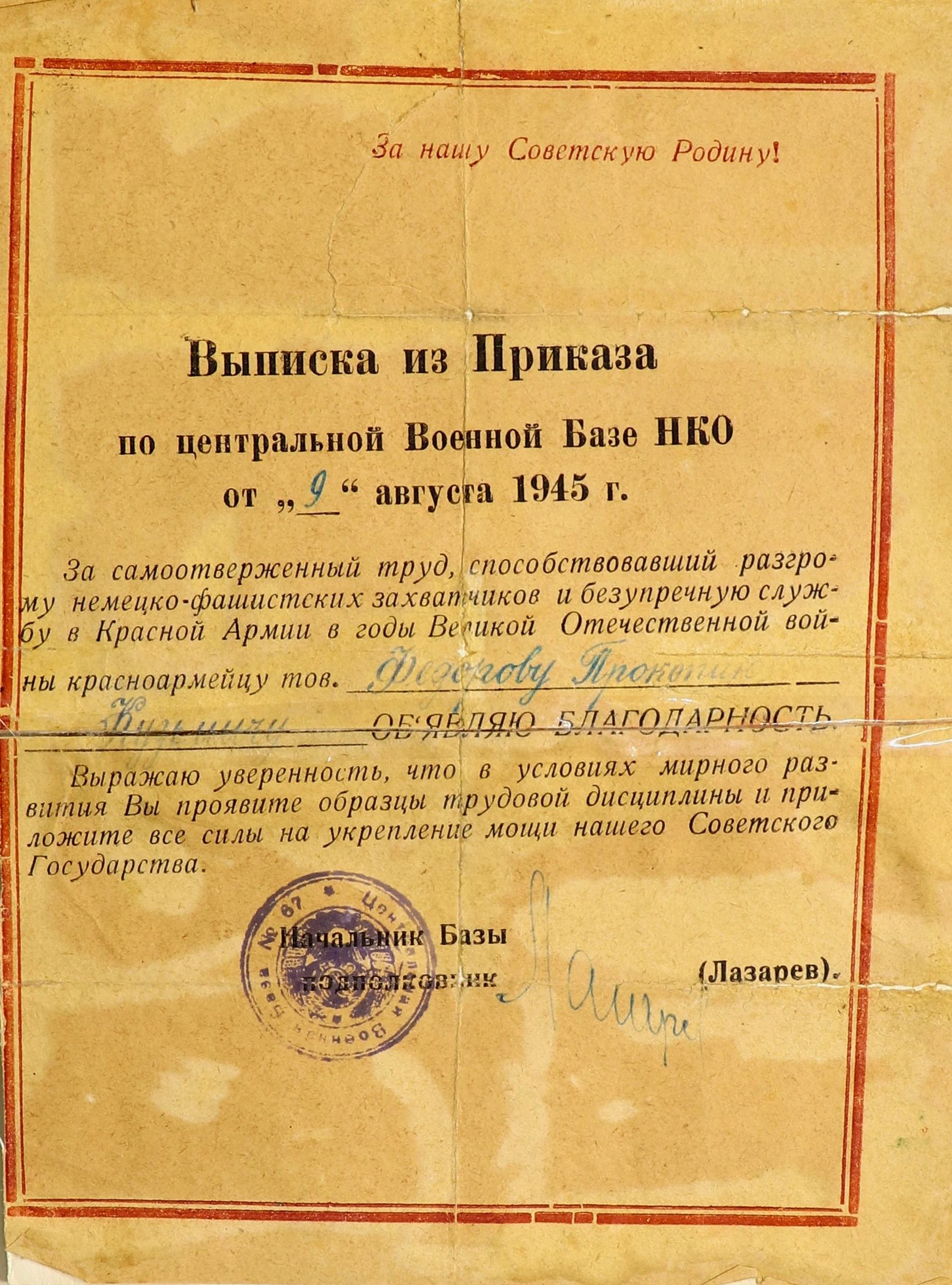 Выписка из приказа по центральной Военной Базе НКО от 09 августа 1945 года уроженцу села Большое Афанасово Нижнекамского муниципального района, участнику Великой Отечественной войны 1941-1945 г.г.,Федорову Прокопию Кузьмичу