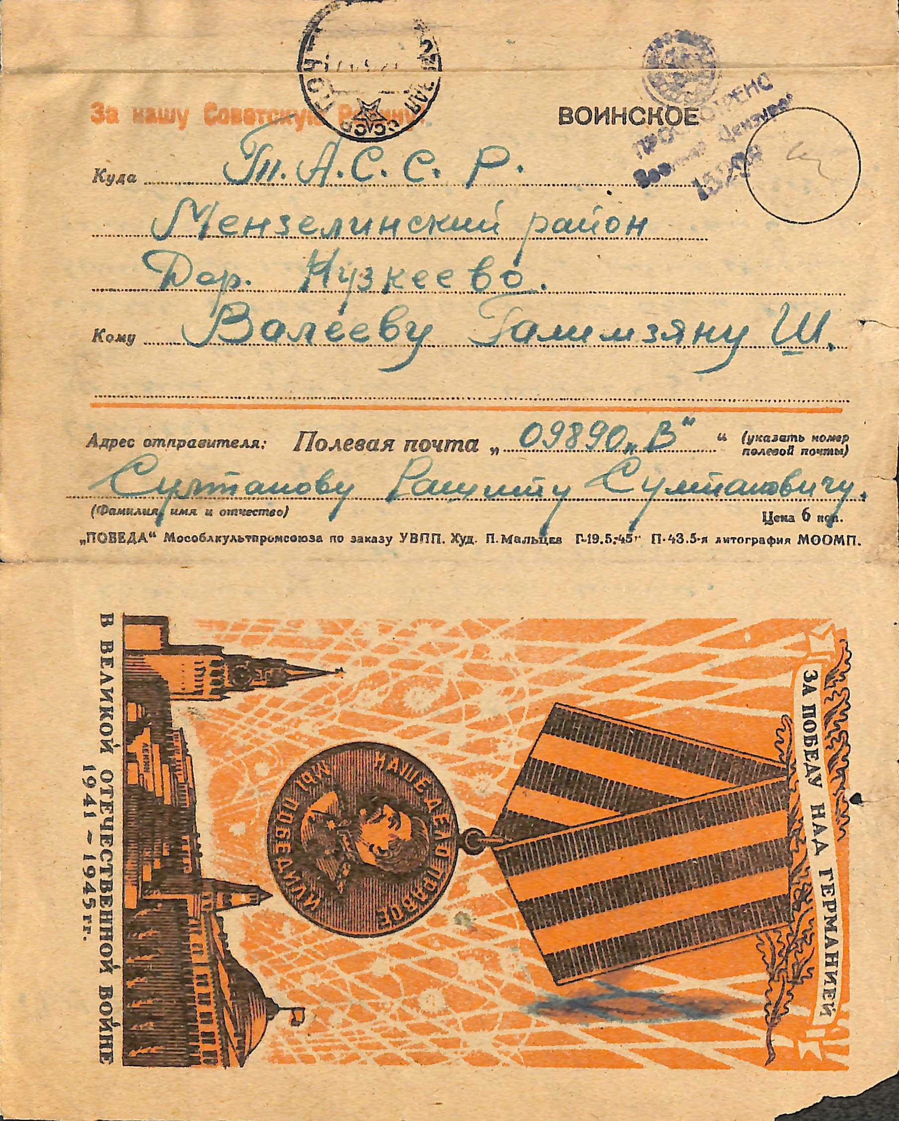 Воинское письмо Султанова Рашита Султановича на бланке воинского письма –«Победа» от 19.05.45 из коллекции солдатских писем фонда личного отличника народного образования, заслуженного учителя школы РСФСР, краеведа, награждённого медалью «За доблестный труд в Великой Отечественной войне 1941-1945 гг.»