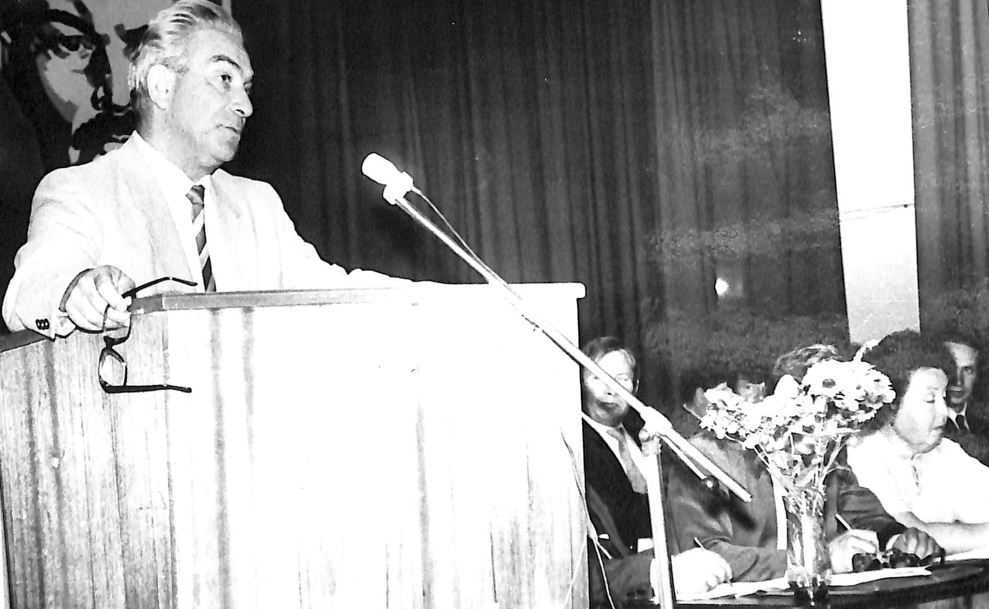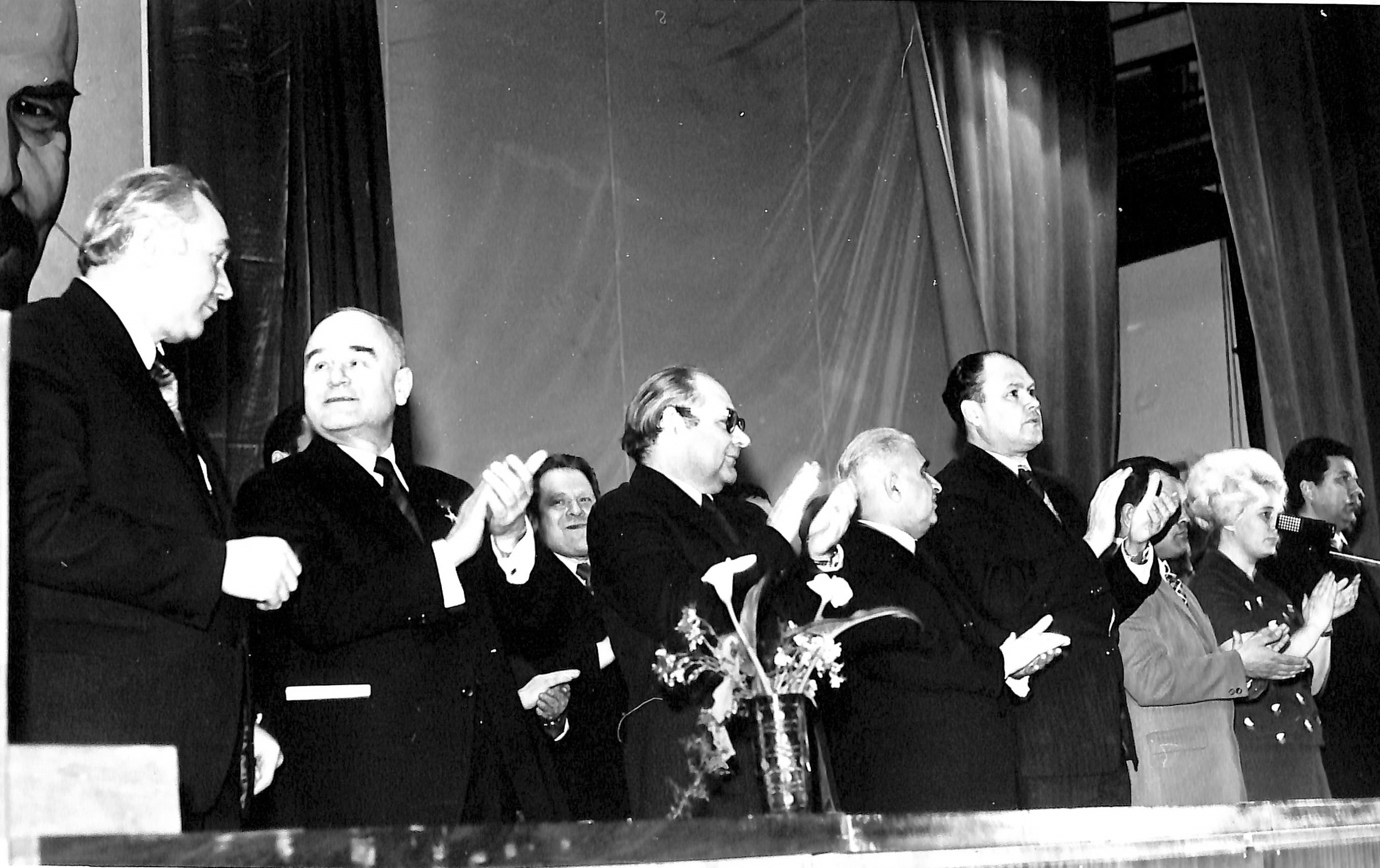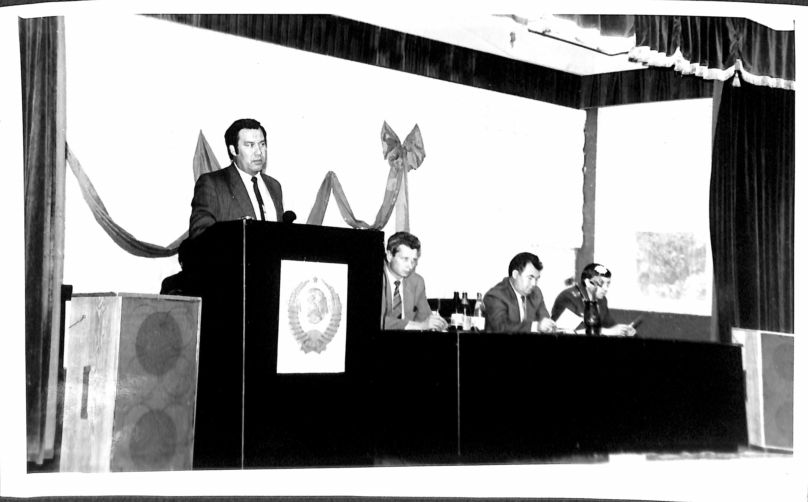 Член коллегии Министерство нефтехимической и нефтеперерабатывающей промышленности, начальник объединения «Союзкаучук» О. Г. Мурадьян на торжественном собрании, посвященном 10-летию переименования поселка Нижнекамский в город Нижнекамск, 4-ый слева между Н. В. Лемаевым, директором Нижнекамского хим.комбината и И. Х. Садыковым, первым секретарем Нижнекамского горкома КПСС.