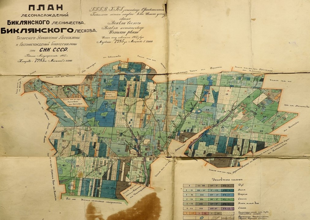 План лесонасаждений Биклянского лесничества, Биклянского лесхоза, Татарского управления Лесоохраны и Лесонасаждений Главлесоохраны при СНК СССР. Ревизии Лесоустройства-1937 г., Площадь-7285 га, Масштаб-1:25000