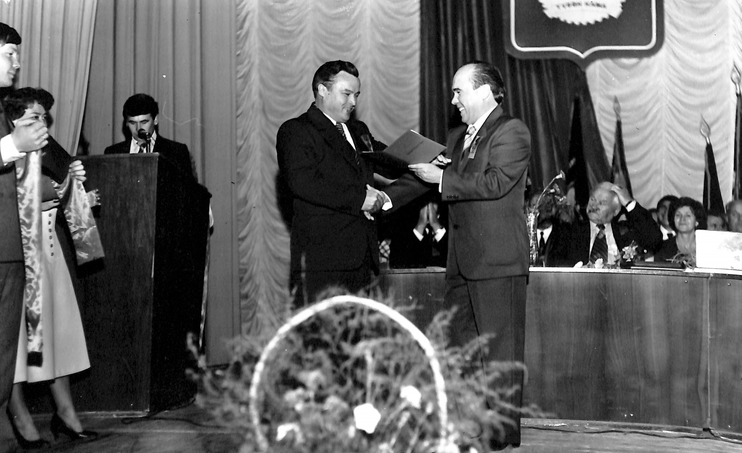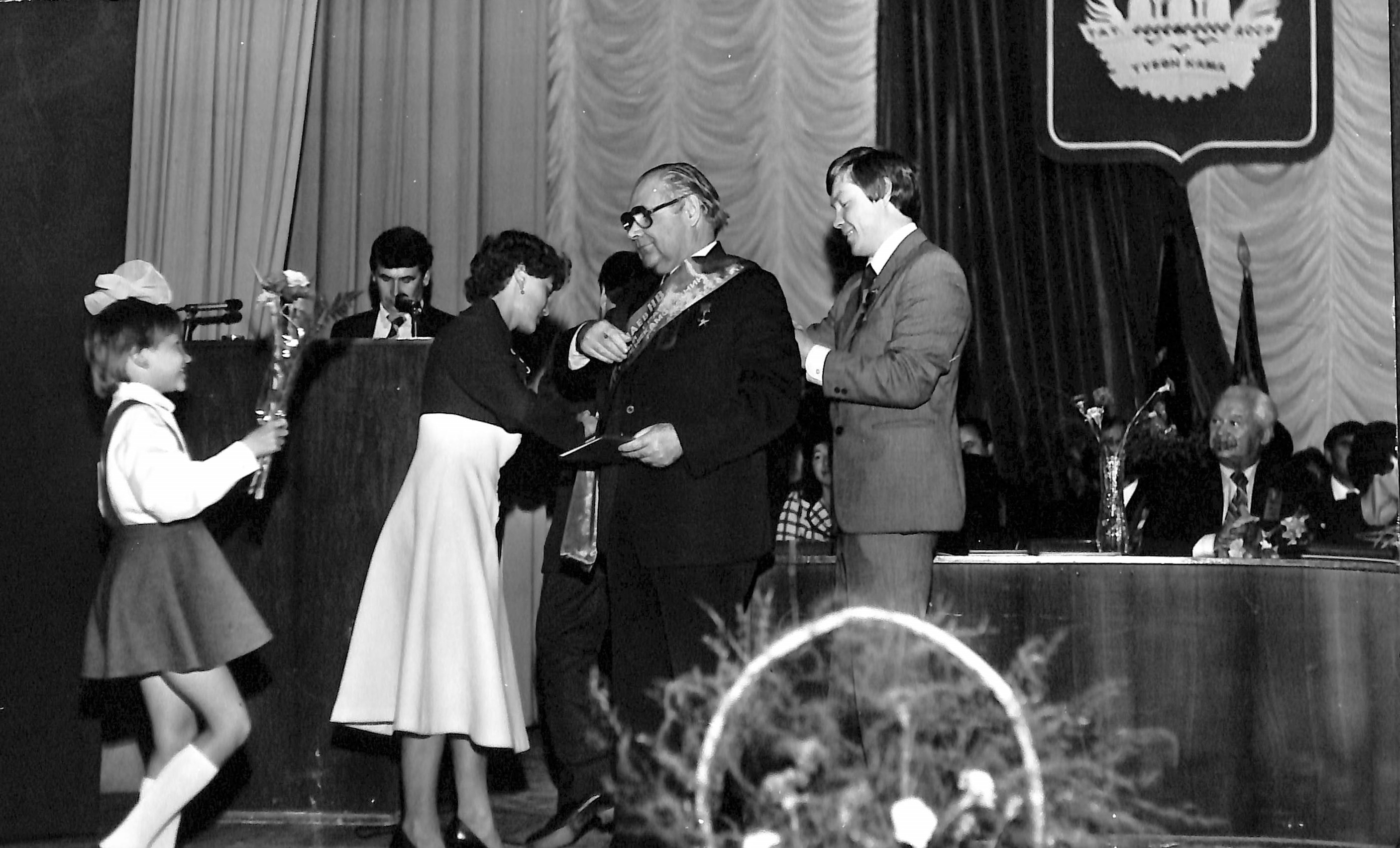 Награждение Николая Васильевича Лемаева, директора нефтехимкомбината, Героя Социалистического труда на торжественном событии, посвященном 15-летию переименования поселка Нижнекамский в город Нижнекамск.