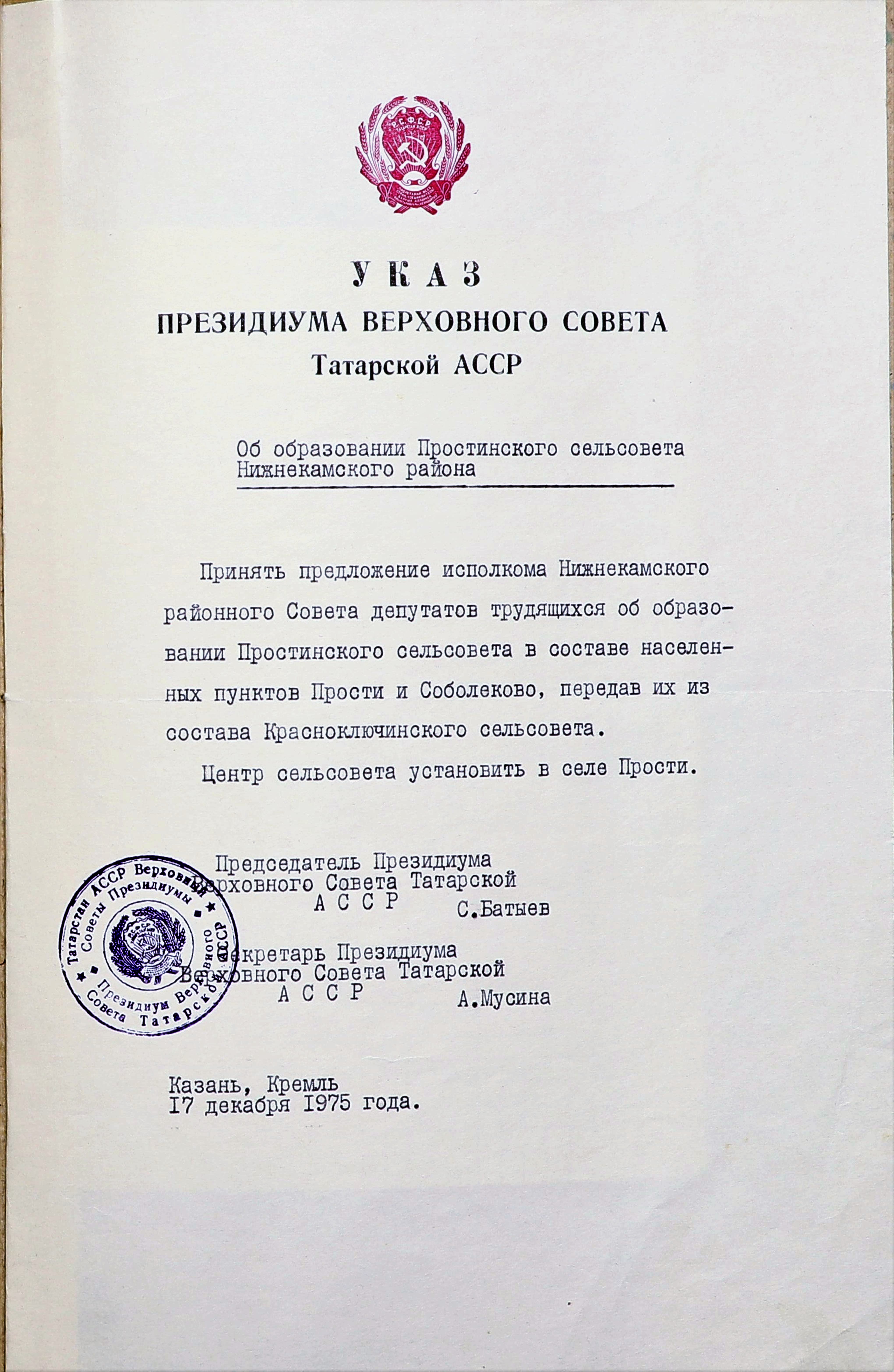 Указ Президиума Верховного Совета ТАССР «Об образовании Простинского сельского Совета от 17.12.1975
