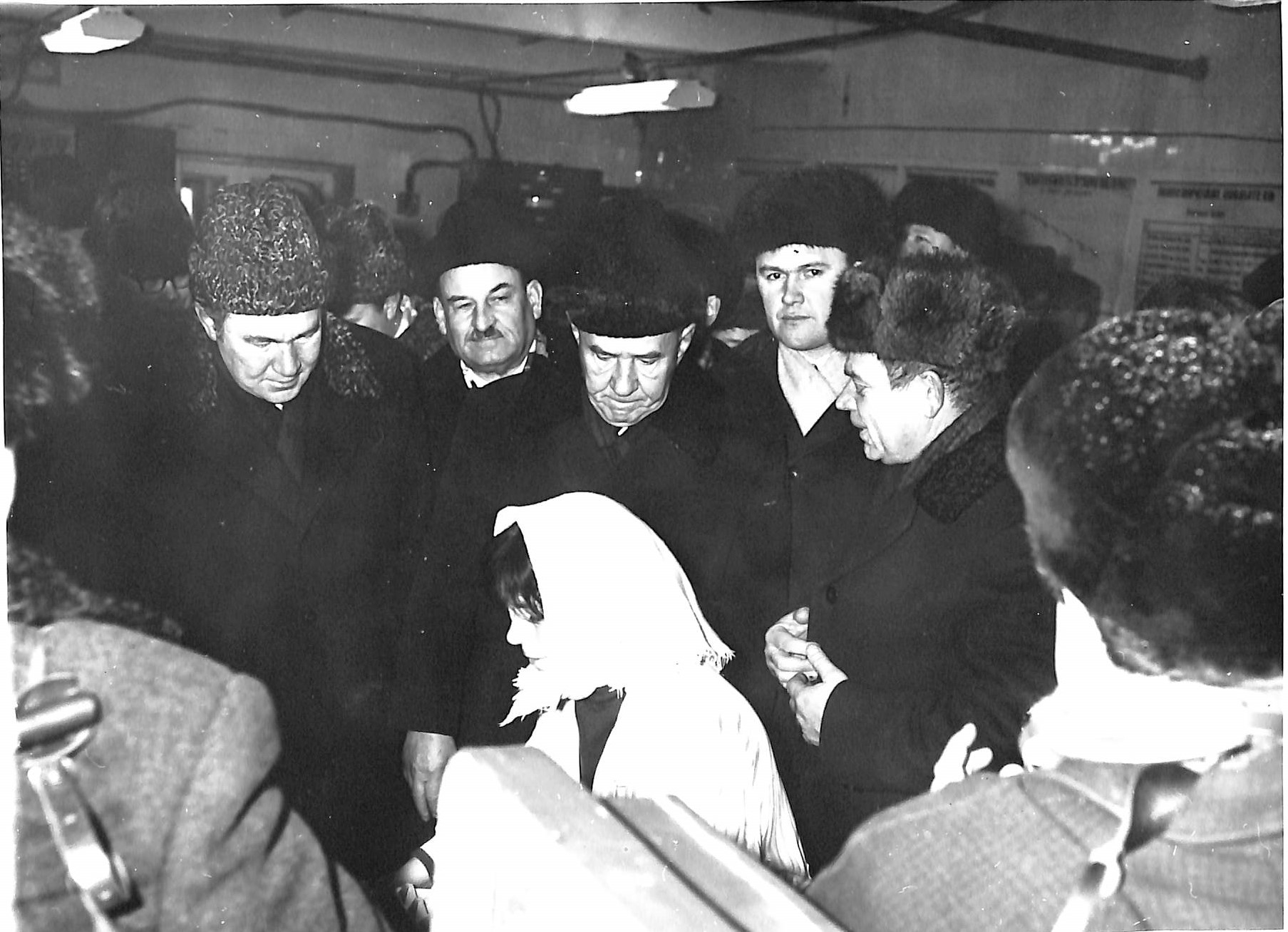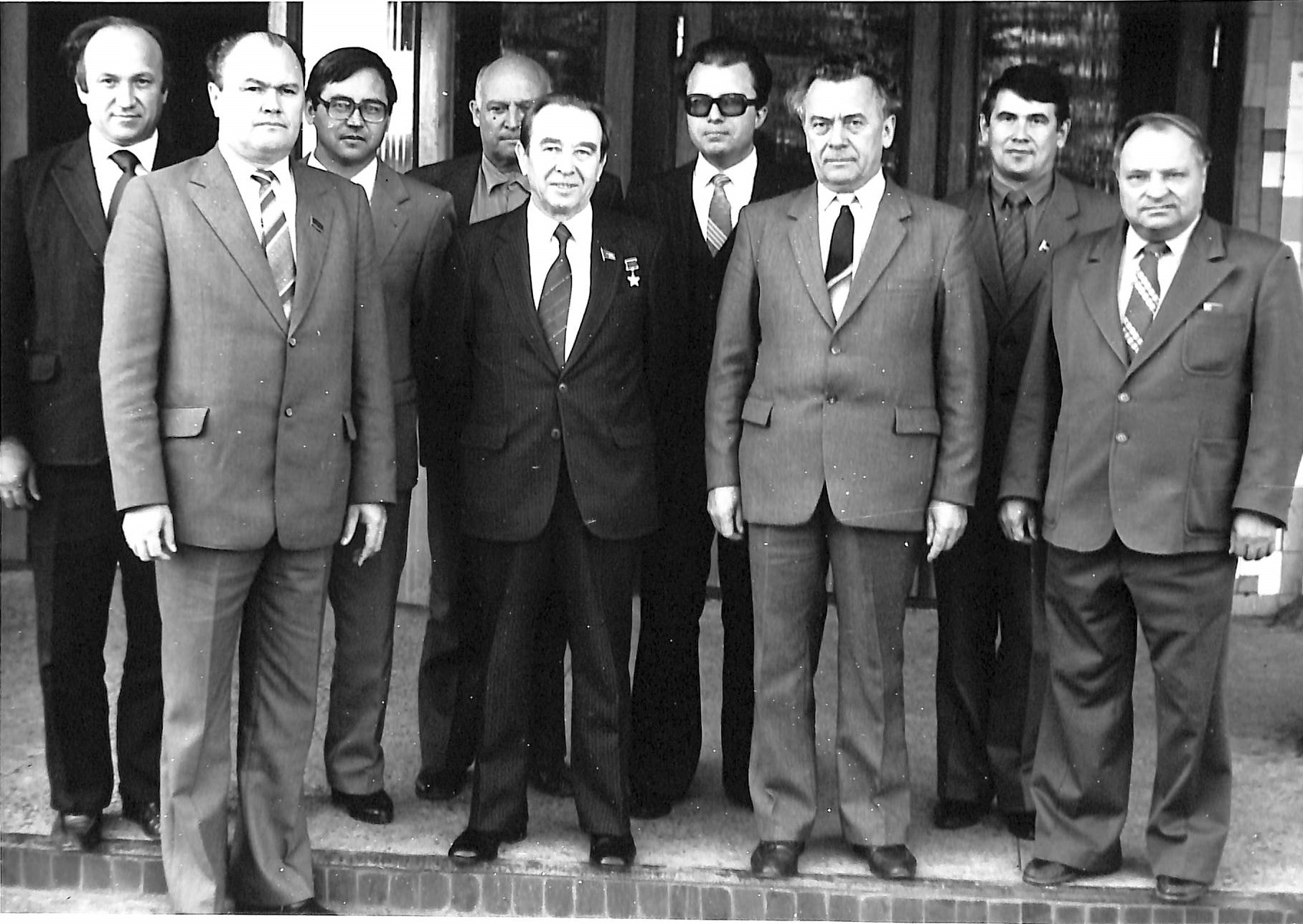 Председатель правления Госбанка СССР, Герой Советского Союза В. С. Алхимов в г. Нижнекамске. Слева направо: Г. З. Сахапов – главный инженер п/о «Нижнекамскнефтехим», И. Х. Садыков – председатель Совета министров ТАССР (1970-1983 годы-первый секретарь Нижнекамского ГК КПСС), Р. Ш. Шамгунов-первый секретарь горкома КПСС, В. К. Соколов – управляющий госбанком г. Нижнекамска, В. С. Алхимов; референт; М. И. Галимов-управляющий Татарской республиканской конторой Госбанка СССР, Ф. К. Кутдусов-первый заместитель председателя исполкома горсовета, А. В.Тимофеев-председатель исполкома райсовета.