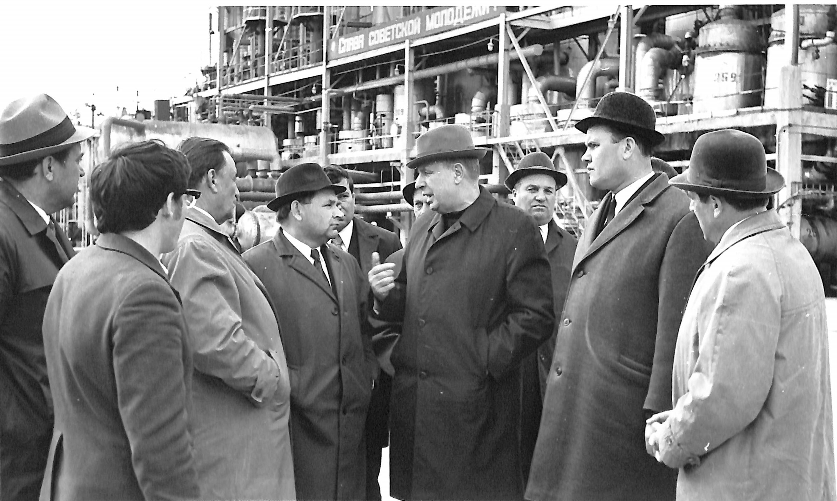 Зам. Председателя Совета Министров СССР В. Н. Новиков на заводе «Этилен-450». Разговаривает с директором нефтехимкомбината, Героем Социалистического труда В. Н. Лемаевым.