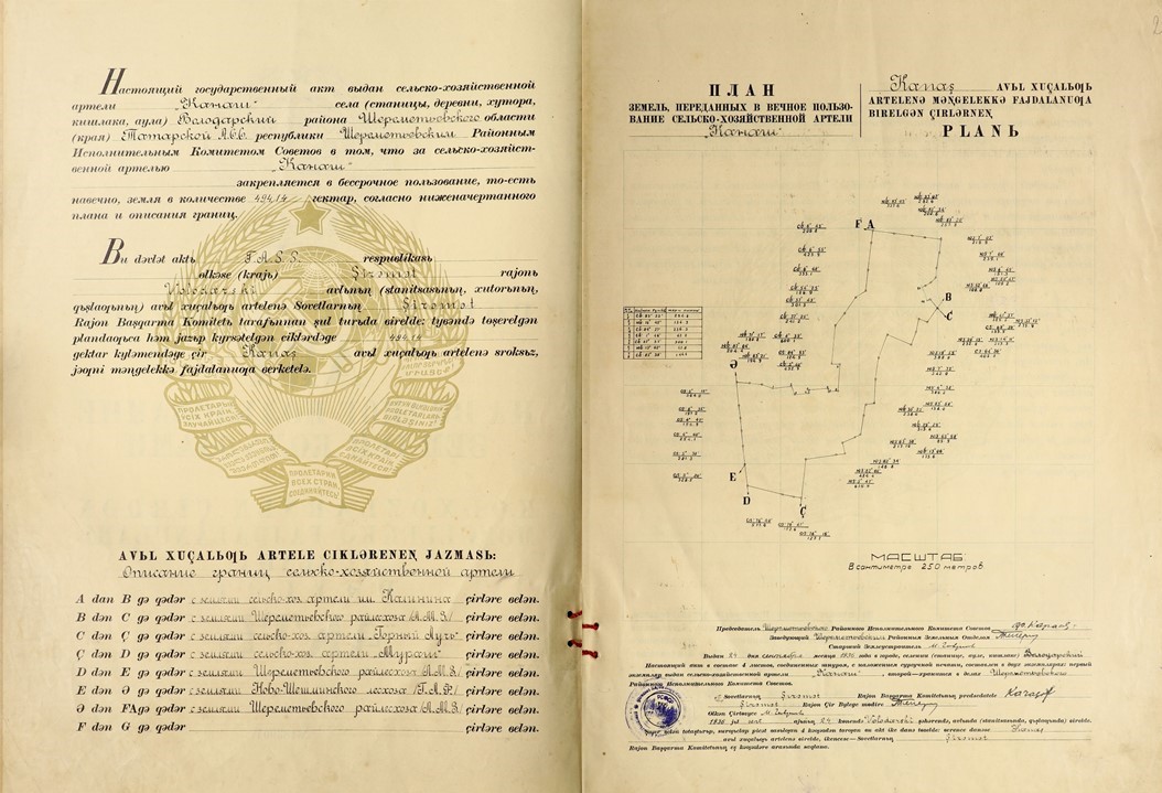 Государственный Акт на вечное пользование землей колхозами от 1936 гола. Колхоз «Канаш», Шереметьевского района ТАССР