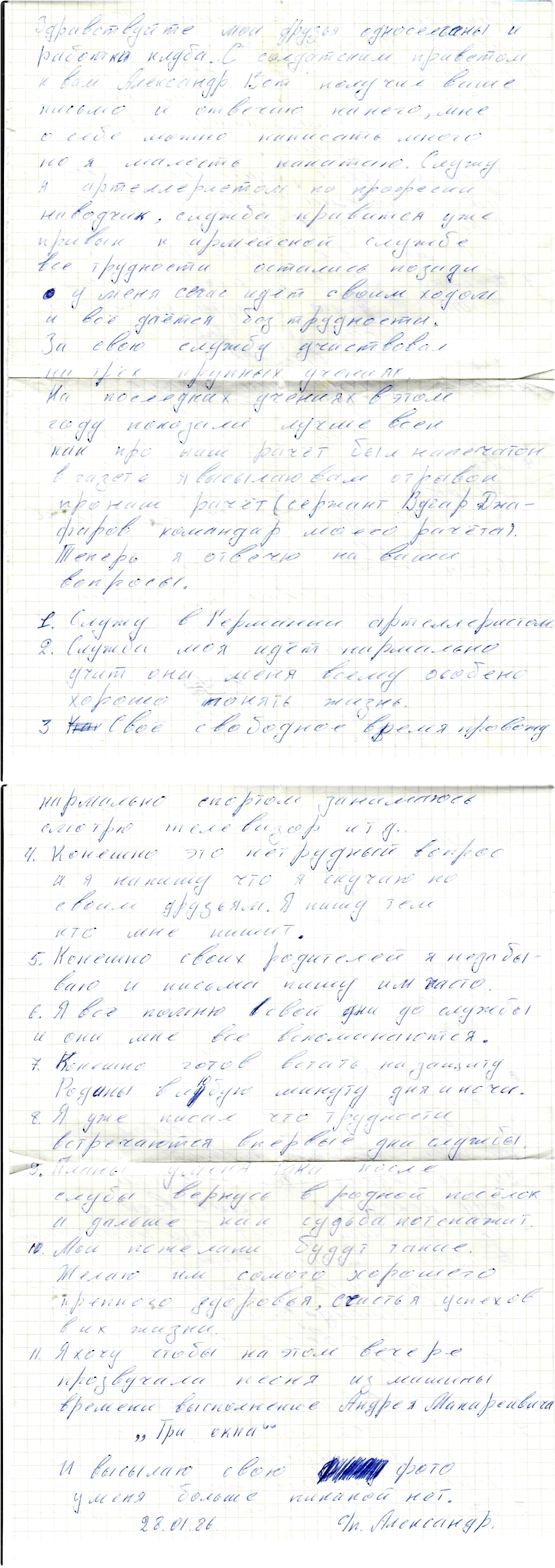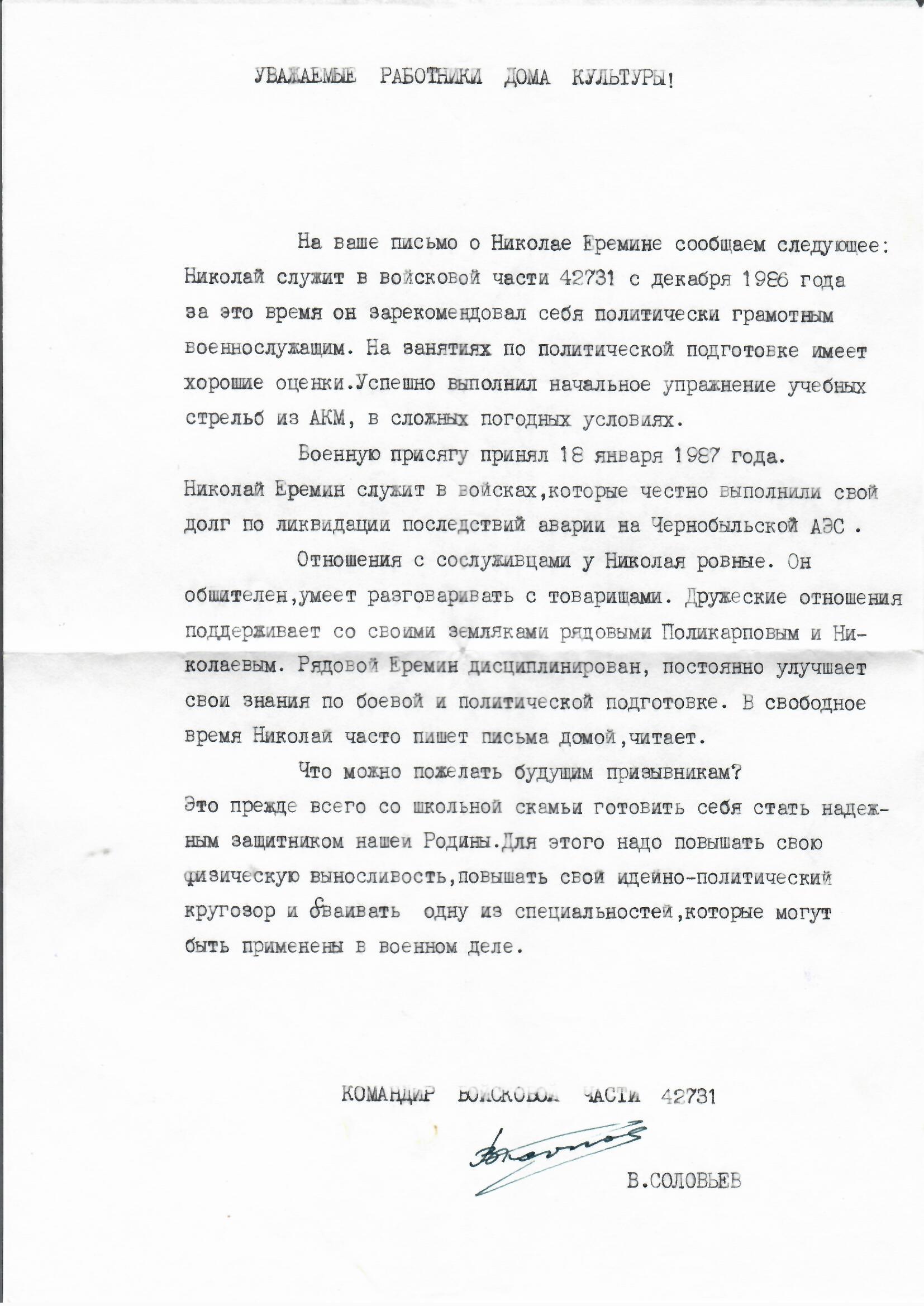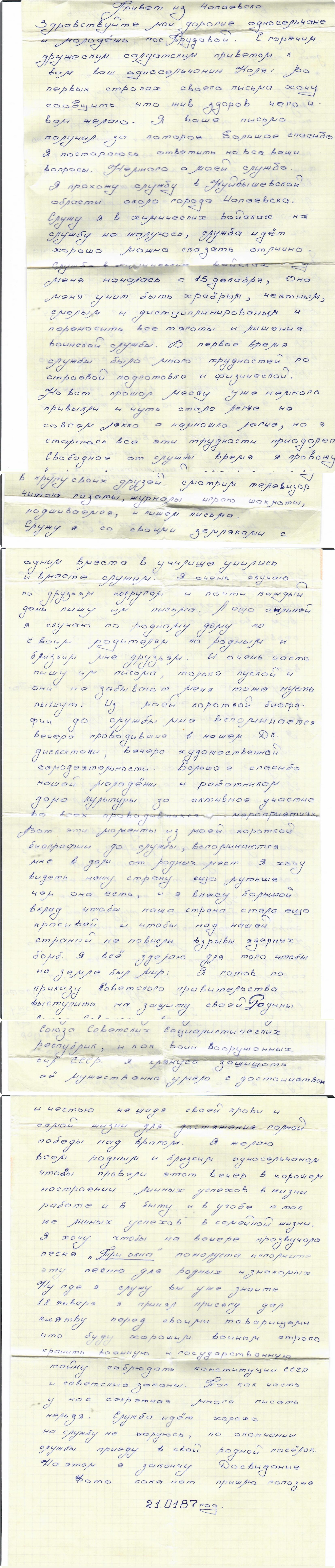 В поселке Трудовой Нижнекамского района в сельском доме культуры поселка часто проводили вечера «По письмам солдат-земляков и их командиров», посвящённые Дню защитника Отечества. На вечерах присутствовали ветераны боевых действий, родители солдат и просто жителей поселка Трудовой. Именно к этому дню приурочивали чтение благодарственных писем от командиров воинских частей, где проходили службу ребята. С большим волнением, трепетом и гордостью слушали односельчане письма от самих солдат-земляков и командиров о том, как служат земляки в различных регионах нашей необъятной страны. Солдатские письма во многом схожи. Ребята в них подчеркивали полезные стороны солдатской службы, писали, что она воспитывает самостоятельность, терпеливость. В зачитанных на вечерах письмах звучали благодарность командиров родителям военнослужащих и также благодарность в адрес работников дома культуры.