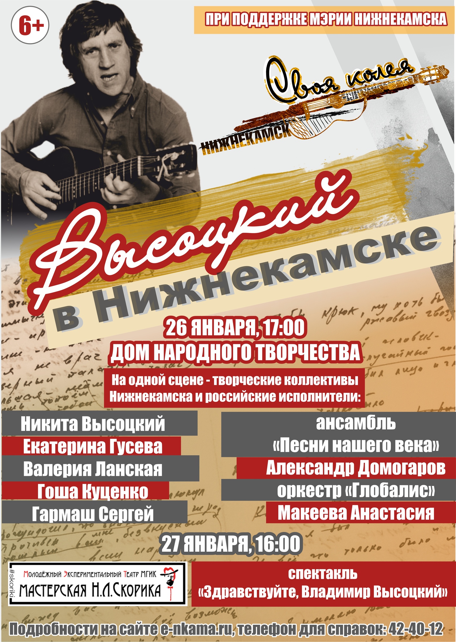 В шестой раз проект приезжает в Нижнекамск. Причём это не растиражированные гастроли, а «штучная» программа, которая в прошлом году, например, создавалась совместно с местными артистами. В этот раз Никита Высоцкий, главный организатор и вдохновитель проекта, опять удивит Нижнекамск – на следующий день после концерта в городе пройдёт спектакль, режиссёром которого стал сын легендарного поэта и музыканта.